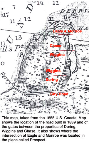 5. Place Called Prospect When Squire Chase returned permanently to Shelter Island in late Summer 1836, he had a mission: his City of Sobrie at the “place called Prospect near Deering’s Harbor,” as all the deeds describe the location. He had already laid out his streets, with the blocks bounded by the streets, 9 rods by 9 rods square, and early in 1836, while still working at Little Gull Island, he had sold some lots. He was busy, indeed, in 1836. (Click on the map to see the place called Prospect.) ![]() On May 9, 1836, he and Rebecca sold for $216 to Ezekiel E. D. Skinner of Greenport two parcels near Dering’s Harbor. The first was an 81 square rods block, which included lots numbered 41, 42, 43, and 44, bounded on the North by Washington Street, on the East by Eagle Street, and the South by Adams Street, and on the West by Fair Street. The second was a 90 square rods block directly across Washington Street. It was bounded by Washington Street to the South, West by the land of Albert S. Chase (presumably land he had given or sold to his son), North by the high water mark of Greenport Harbor, and East by land of Israel Fanning and Nathan Wiggins. On June 29, 1836, he and Rebecca sold to Nathan Tuthill Hallock and Pease M. Case both of Shelter Island and former mariners, for $120 two parcels. One was 81 square rods, lots numbered 37, 38, 39, and 40, bounded North by Washington Street, East by Carbon Street, South by Adams Street, and West by Eagle Street. The second lot was directly across Washington Street but was only half a block, or two lots equalling 45 square rods, bounded South by Washington Street 4 1/2 rods, West by land of Israel Fanning and Nathaniel Wiggins 10 rods, North by high water mark 4 1/2 rods, East by land of Joseph Congdon 10 rods. On September 5, 1836, Frederick and Rebecca sold for $76.50 a 90 square rod lot to Salem G. Prince of Greenport, a carpenter, bounded on the South by Washington Street, West by Cedar Street, North by the high water mark, and East by the land of Albert S. Chase. On the same day, they sold to William S. Beebe, also a carpenter in Greenport, for $40.50, lots 31 and 32, 40.5 square rods, bounded North by Adams Street 4.5 rods, East by Eagle Street 9 rods, South by Jefferson Street 4.5 rods, and West by land of Joshua Payne, 9 rods. On September 12, 1836, Frederick and Rebecca sold to Justus E. Horton, also a carpenter in Greenport, for $46.50, lots 21 and 22, 40.5 square rods, bounded North on Jefferson Street 4.5 rods, East by land of Sherbeim A. Beckwith, South on Madison Street 4.5 rods, and West on Cedar Street. On October 21, 1836, Frederick and Rebecca sold to Israel Young of Franklinville (now Mt. Laurel) in Southold for $63 a 31.5 square rod lot bounded 3 rods on Washington Street, West 10.5 rods by land of Harden Ryder, North 3 rods by the high water mark, and East by land of Frederick Chase. On October 24, 1836, Frederick and Rebecca sold to Benjamin W. Young, also of Franklinville, identifed as Yeoman, for $96 a 48 square rod plot, bounded West on Carbon Street 3 rods, North by land of Frederick Chase 16 rods, East by waters of Dering Harbor 3 rods, and South by land of John Wells 16 rods. On October 26, 1836, Frederick and Rebecca sold to J. Hubbard Reeve, farmer of Greenport, for $208 a lot containing 84 square rods, bounded South by the head of High Street and land of Frederick Chase 16 rods, West by the common high water mark of the Ferry 6 rods, “on a due South line from the northwest corner of the within described lot” due North on land of Frederick Chase 12 rods, and East on land of Frederick Chase 6 rods. Clearly, this lot does not fit within the grid. Where is High Street? Does “the Ferry” suggest the wharf? On December 5, 1836, Frederick and Rebecca sold to Joshua Payne, carpenter from Greenport, for $40.50 a 40.5 square rod plot, lots 29 and 30, bounded North on Adams Street 4.5 rods, East by land of William S. Beebe, South on Jefferson Street 4.5 rods, and West by Fair Street. While no deeds dated in 1837 were recorded, apparently there were othr transferred before 1838, such as the lot of daughter Rebecca Chase Beebe, noted in the first 1838 deed. On January 1, 1838, Frederick and Rebecca sold to their daughter Lydia Caroline Chase Boardman for $40 a 40.5 square rod plot of land. It was bounded North by land of daughter Rebecca Beebe 9 rods, East on Fair Street 4.5 rods, South on Adams Street 9 rods, West on Cedar Street 4.5 rods, being the south half of the block identified on the place called Prospect map as 45, 46, 47, and 48. Also, on January 1, 1838, Frederick and Rebecca sold a lot on the Southeast corner of Washington and Cedar streets to Joseph H. Skillman of Shelter Island, a merchant, for $50. He was the husband of their daughter Emeline. It was an estimated 40.5 square rods. It is three rods directly West of the block that contained lots 45, 46, 47, and 48, which suggests that the streets in the place called Prospect were three rods wide, or approximately 50 feet. Duvall states that Joseph Skillman ran a store at the place called Prospect for many years. On October 17, 1839, Skillman and his wife Emeline sold the same lot back to Frederick for $965. On May 10, 1838, Frederick and Rebecca sold two lots to Joseph Penny of Greenport for $432.68. The first was a 81 square rods block and was bounded South by Monroe Street, West by Fair Street, North by Madison Street, and East by Eagle Street, the intersection of the highway to the City which was under construction. The second was 51.25 square rods, bounded South on Washington Street 5 rods, West on land of Frederick Chase 10.25 rods, North by the high water mark 5 rods, East by land of Israel Young 10.25 rods. ![]() (To travel the route, turn off West Neck Road (was City Road) north onto New York Avenue, travel over the land of Esther Sarah Dering to the sign which reads “1872 Shelter Island Heights Historic District.” This is the beginning of