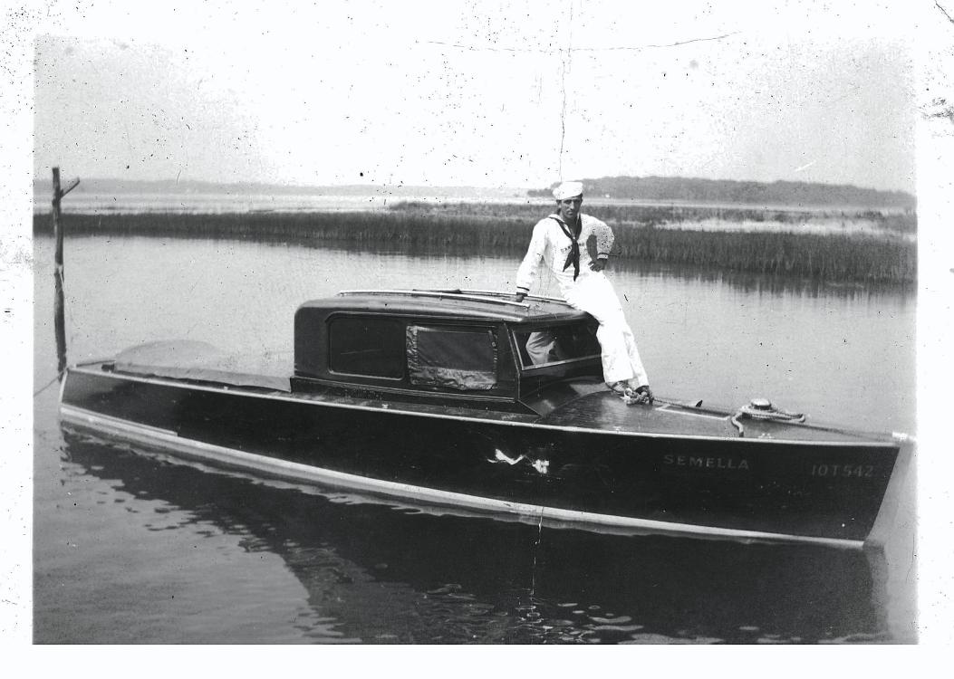 Foltis' Chris Craft speedboat moored at Taylor's dock, with Alex Nestor, skipper - taken in 1937. Boat new in 1937, destroyed in 1938 hurricane
