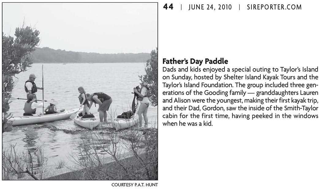 In June, the Shelter Island School had its annual visit and picnic on Taylor's Island. Shelter Island Kayak Tours and the Taylor's Island Foundation hosted a Father's Day Paddle to Taylor's Island. The Foundation held an Appreciation Day and Picnic at the Duck Walk Vineyard to thank all the people who are helping Taylor's Island in various ways. In July, the Shelter Island Public Library organized a tour of Taylor's Island. Also in July, P.A.T. Hunt gave a narrated slide and film presentation about Taylor's Island at the Shelter Island Historical Society's Haven House Barn.
