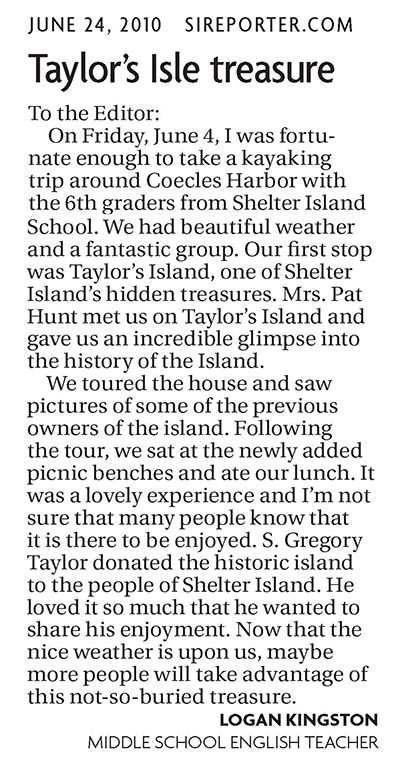 Taylor's Island art went on exhibition in March at the Shelter Island Town Hall. In June, members of the Shelter Island Senior Citizen's Association (SISCA) walked out to the Island at low tide. The Shelter Island School visited the cabin and wrote to the Reporter in June. Shelter Island Kayak Tours had a Father's Day paddle to Taylor's Island complete with a picnic. Camp Quinipet made two visits by kayak, the second was an overnight stay for twenty campers.