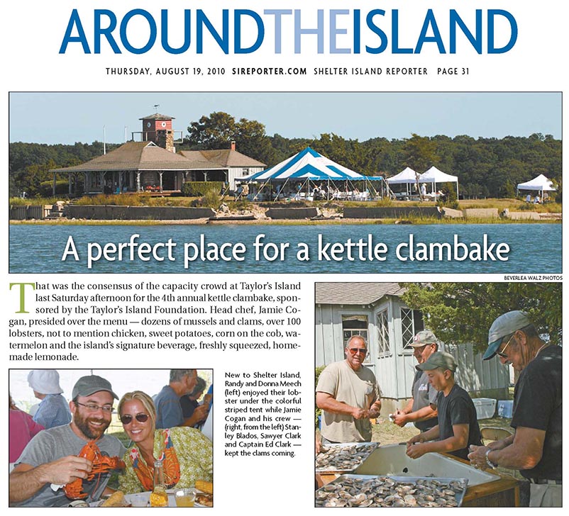 Kettle Clambakes have become an annual festivity on Taylor's Island.One hundred guests from Shelter Island and beyond come to the Island to enjoy delicious food and the Island's magic. Taylor's Island also hosted a Wellness Day, Overnight Guests, and a 50th wedding anniversary celebration in 2009.
