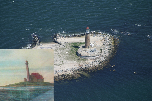 ![]() This is a recent Peter Boody photo of Little Gull Island with a portion of a painting of the lighthouse that was there when Frederick Chase was lighthouse keeper from 1826 to 1836. The original painting is on display at the Marine Museum in Greenport, in the Railroad Station. |