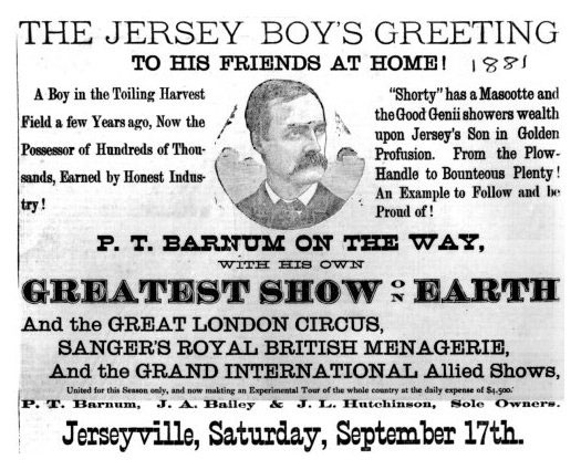 Examiner, Jerseyville, Illinois, September 7, 1881, noted:“This tremendous consolidation, conceded the most extensive, respectable and moral exhibition anywhere in the wide world, will give two performances here on Saturday, September 17 ... So large is this great establishment that it performs only in the larger classed towns en route, and only pauses here because one of the proprietors, James L. Hutchinson, was born and reared here. His mother, sisters and a brother and many other relatives, greatly beloved by him, are still residents of this city and county. “Almost everybody remembers a little fair-haired boy, always bright and cheerful, who was daily seen on our streets only a few years ago. His family was poor, but frugal and honest. He was popular with everybody because of his manly ways, frank demeanor and industrious habits. He grew up to manhood used to the hardships of laborious life. He worked in the adjacent harvest fields at twenty-five cents per day; set type in the UNION office for Doublebower for which he received pied type for compensation and with which he published a little two column paper once a week himself. The circulation, like the material, was limited, but only goes to show what sort of stuff the then man-boy was made of. He also clerked in Vandervoort's store for, we understand, one hundred dollars a year. But this slow going business was too monotonous for the ambitious ‘Shorty’ Hutchinson, as his friends still call him. After a year or two's experience as agent and side-show lecturer with smaller shows, he went, in 1870, with P. T. Barnum as Mr. B's book agent. From that moment his fortune was made. He has gone up, up, up, until today he is accredited with being worth a half a million dollars, besides he is the honored friend of Mr. Barnum and his valued associate in business, together with James A. Bailey. “The management has no hope that the receipts will cover the enormous expenses. It is only to let Hutchinson's friends and relatives see the largest show in the world that it stops here on its way from Chicago to St. Louis. Well may we felicitate ourselves on this opportunity to see what President Garfield and his cabinet, the United States senate in a body, the general of the Army and the foreign ministers in Washington have pronounced the ‘most extraordinary and perfect exhibition in the world.’” An ad on the front page of the Brooklyn Eagle on Thursday, May 15, 1884 boasted of the circus having 40 elephants. “Grand Triple Alliance Circus, with Three full companies in Three Rings. Enormous Double Menageries of Wild and Trained Beasts. Hugh Elevated Stage for special and high class performances. Roman Hippodrome with Gladitorial Contests and Sports. Immense Ethnological Congress of Strange and Savage Tribes, Mammoth Museum of the World’s Wonders and Curiosities.” The ad continued, “Everything and Each Featured Just as it was exhibited in Madison Square Garden. All the Splendidly Gorgeous Circus. All the Fearless and Thrilling Races. All the rare animals, strange people, living wonders, exciting contests, and Truly Tremendous Attractions that Enraptured and Delighted a million people in New York, and will charm ten millions more this season. “The greatest assembly of curious human beings ever seen together on earth. Collected only after three years constant and persistent researches in almost every portion of the known world. Of incalculable benefit to scientists and naturalists, and a never ceasing source of wonderment to ladies, children, and the adult humanity of the country. Exhibited here in this city for the first time, and containing Burmese, Nubian Warriors, Australian Cannibals, Zulu Chiefs, Japanese, Chinese, Syrians, Patagonians, Buddhists, East Indians, Todas People, Aztecs, or ancient sun worshipers, Afgans, Hindoos, real Nantch Dancing Girls (first ever here), and Sioux Indians, Boomerang Casters and many others.” At the end of the circus season in 1887, at the age of 41, Hutchinson retired from the circus. He was bought out by Barnum and Bailey for $650,000. Shortly, thereafter, the entire property of the Barnum & Bailey Circus in Bridgeport, Connecticut was destroyed by fire. People referred to “Hutchinson’s luck,” his having sold out before the show suffered this financial setback. John W. Rae's book -- Morristown's Forgotten Past: The Gilded Age -- tells of Hutchinson in New Jersey. "Another resident of Madison Avenue was famous in the gaudy world of show business. He was James L. Hutchinson, the third member of the Barnum Circus Firm when the circus wagons and advertising were all lettered Barnum, Bailey and Hutchinson. “On one of the circus’ numerous visits to Morristown, a community regarded in the Gilded Age as ‘a good circus town,’ he told J. Frank Holloway, for many years chief of police, that he liked Morristown and intended when he retired to make his home here. It was not an idle remark for he did come to Morristown in 1902, purchasing from John M. Chapman the mansion at 148 Madison Avenue for $28,000. “The arrival of the Big Top in Morristown in Hutchinson’s day was an event that broke the barriers between the socially elite and towns folk in many respects. All went to the parade and three ring shows. “Nothing in show business could match the great excitement of the circus parade through the streets of Morristown. It started before daybreak when several trains started unloading at the Morris Street crossing, accelerated as the parade rolled through town with its display of ornately carved wagons, lumbering elephants and a celliope or ‘steam wagon’ that always brought up the rear because its boiler sometimes blew up. “Billboards were posted around town for days before the event advertising ‘Superb Troupes and Groups of Trained Animals in Wonder Commanding Displays,’ a’ 61 Horse Act, Congress of Wild Beasts’ and ‘Fabulous Trapeze Artists.’ “By common agreement wi