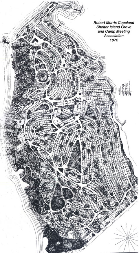 1872 Copeland Design, Illustration 4.)According to the 1993 registration to the National Park Service from Shelter Island Heights for a designation as a Historical District, which was compiled by Patricia Ryan, Copeland was born in Roxbury, Massachusetts in 1830. He first practiced landscape architect with Horace William Shaler Cleveland, brother of President Grover Cleveland, establishing their partnership in about 1855 in Boston. They advertised themselves as able to “furnish plans for the laying out and improvement of Cemeteries, Public Squares, Pleasure Grounds, Farms and Gardens, as well as for the construction of every species of Building connected with Agriculture, Horticulture, and general rural improvement.” This partnership was dissolved during the Civil War years. Copeland was a contemporary of Frederick Law Olmsted and Calvert Vaux and was competing for commissions. Copeland’s writing on landscape architecture was prolific. He was familiar with the popular planning convention of Methodists camps in the mid-nineteenth century of the “hub and wheel” layout in which the central element, the prayer grove, was surrounded by concentric rings of streets that were bisected by diagonal routes. He emphasized the controlled, picturesque settings for planned landscapes. This was a reaction to industrialization and urbanization. The picturesque movement sought to emphasize the bucolic and restorative qualities of nature and home life. In these planned rural landscapes nature was manipulated for aesthetic purposes. Typically, the often hilly topography was accommodated by serpentine roads and paths which were organized to enhance already scenic views. By mid-year 1872, Copeland and Charles H. Bateman, his surveyor, had completed their design for the development and lots were numbered. The Copeland map shows the grand plan of the Brooklyn developers. It encompassed the entire peninsula and included winding roads with over 1,000 lots, mostly very small, some average, and some quite large. There was a boat wharf and a yacht wharf in Dering Harbor and Squire Chase’s wharf was to be the steamer wharf for ferries from Greenport and from all over the near eastern seaboard. There are public parks throughout, the most prominent one being the open air amphitheater for a major activity of the resort, religious exhortation. For this was not only to be a safe place for Brooklyn middle class families in the summer, it was to be a Methodist religious experience as well. Not only was the consolidator a minister, the name of the founding organization speaks profoundly of the purpose: Shelter Island Grove and Camp Meeting Association of the Methodist Episcopal Church. The 1872 map filed with Suffolk County on December 31, 1872, only shows the roads laid out and lots to have been auctioned in the summer of 1872: the northern portion of the peninsula. Actually lots outside of this filed map were also sold. |