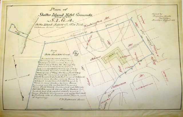 In May 1875, the team of Joseph Battin, Frederick Schroeder, Foster Pettit, and John French leased from the Association for a dollar a year the land at the west side of the present parking lot to build a new Amusement Hall at a cost of $10,000 which was scheduled to open in June 1876. In December 1875, the Association mortgaged the Prospect House and its land with the Germania Saving Bank, Mr. Schroeder’s bank, for $10,000. Attached to the mortgage on file with Suffolk County was a survey. (See 1875 Mortgage Map, Illustration 5) The original had three color inks: red, black and blue. The red shows Squire Chase’s Village, with its streets, Cedar, Fair, Eagle, Washington, Adams, Jefferson. Blocks owned by Lydia Boardman, Robert McGayhey are noted. The black shows the new Prospect Grove streets, Summerfield Place, Wesley and Clinton avenues. The area in blue is the area being mortgaged, including the wharf. This map, drawn by the surveyor Charles Bateman, unequivocally locates Frederick Chase’s Place called Prospect on the 1875, and present, street network. It seems that fish factories were still on the Island during these early years, including one near the base of White Hill, which emanated a very unpleasant odor. Within a year or so, however, it was shut down and the five acres, lot 2000, was purchased by the Reverend Henry M. Scudder of Brooklyn in September 1875. His family still owns the compound. The 1880 Census suggests that at least one fish factory was still on the Island as 10 men were involved in that business. It was probably on Coecles Harbor as Ram Island Road was at that time called Factory Road. Only seven lots were sold in 1875, for a total of $2,350. |