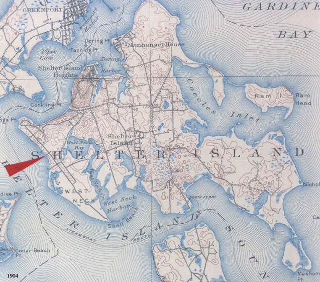 This is a 1904 USGS map of Shelter Island. The red arrow is pointing to the Rocky Point Avenue