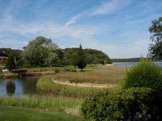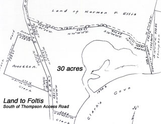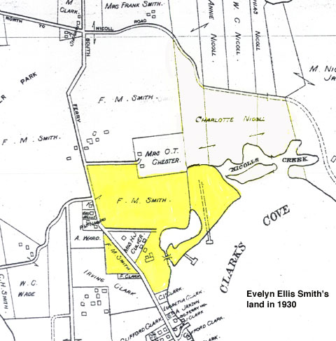 In 1942 Norman lost the deer park property (west of the highway) for nonpayment of property taxes, and in 1946 the Treasurer of Suffolk County issued a deed to Frank P. Chiaramonte and Christ Bastis. Their interests were granted to Michael P. Chiaramonte in 1949 and he deeded the property that year to Ralph C. and Vivian Zehner. The Zehners established the Deer Park subdivisions in 1964 and 1978. In 1944, Norman sold all of the Smith estate east of the highway. The eastern most section was sold to Kenneth W. Thompson and his wife Margaret Van Patten, a total of 8.23 acres. In 1980, Thompson sold it to Aeon Realty Company which immediately transferred it to the Gerard family. In 1999 the Gerard family sold it to the Nature Conservancy which, within a few months, sold the land to James D. and Mary H. Dougherty. The bulk of the Smith property east of the highway was sold to Margaret Foltis who sold it in 1950 to Interstate Enterprises, Inc. which sold it the following year to Herbert A. Laage. He sold it to Mar-Kal Realty in 1956, which developed it as South Ferry Hills and, between 1958 and 1968 sold the land in 72 building lots. Evelyn died in California on June 8, 1957. Frank’s daughter Dorothy Smith Bayley built a house on one of the subdivided lots on Smith Cove and raised her children during the summers there. She died in October 2002. This property in 2003 belongs to Alexander and Nancy Alex. ****
